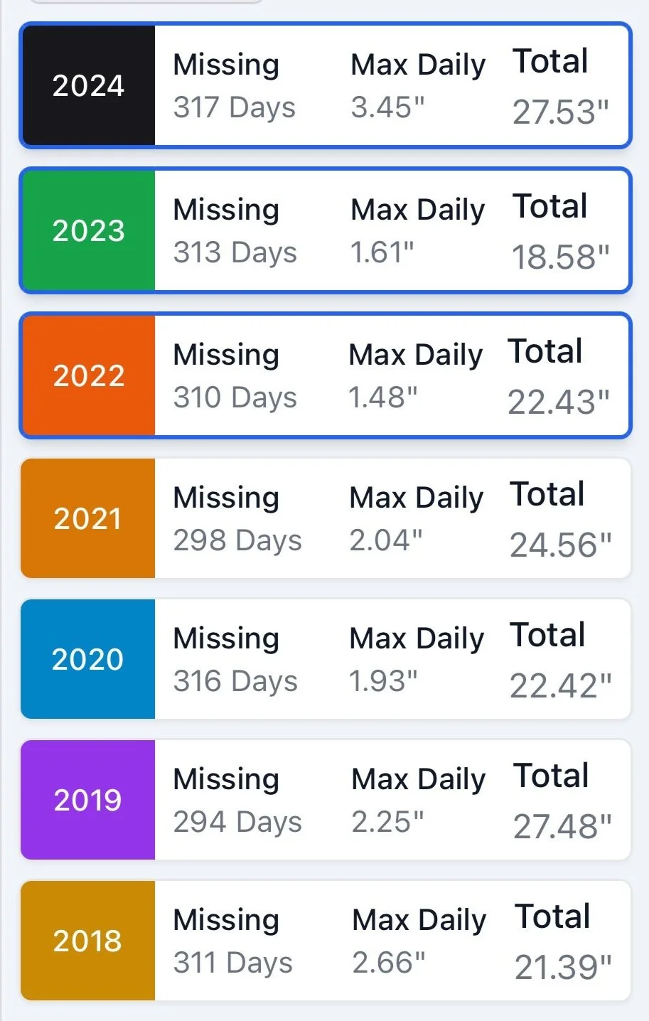 Here are Andrew’s yearly rain total amounts.