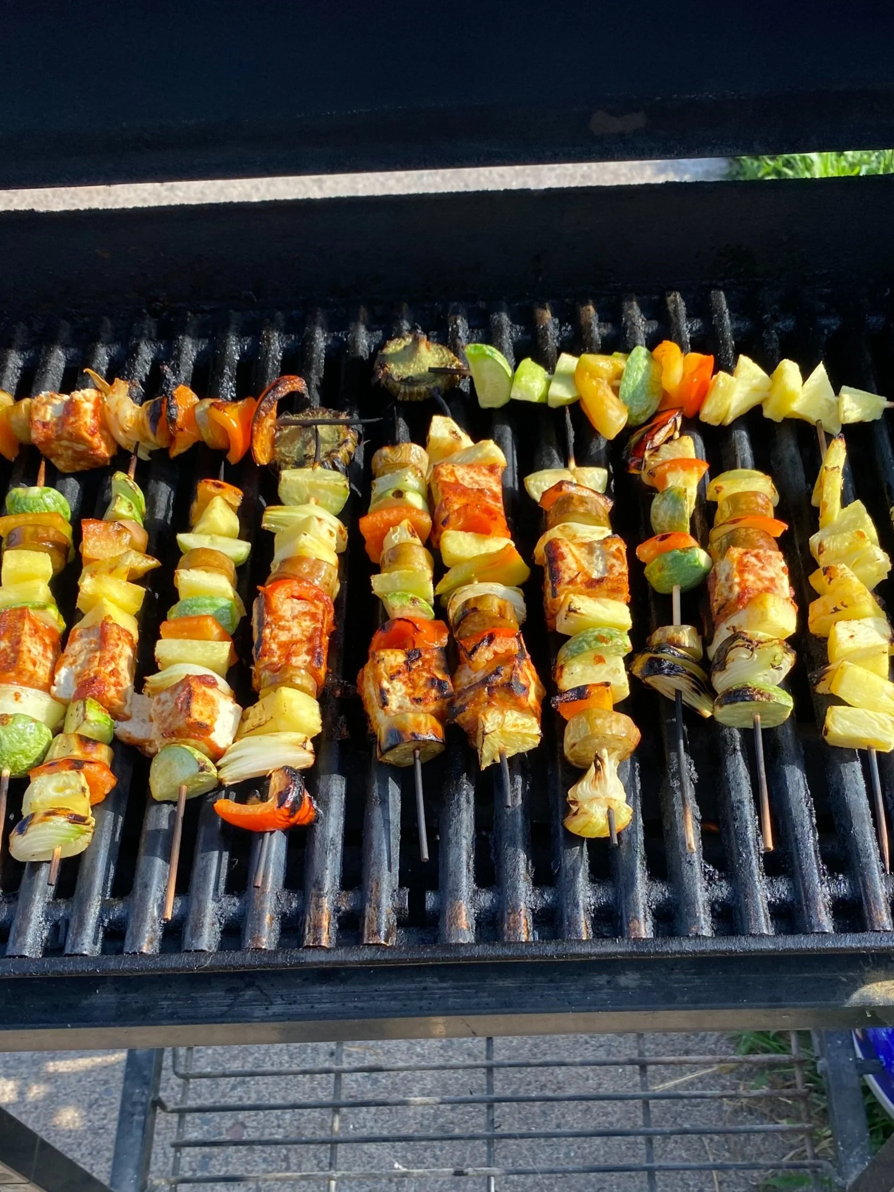 Last week was HOT and called for our meals to be cooked on the grill. BBQ sauce tofu kabobs are shown here.