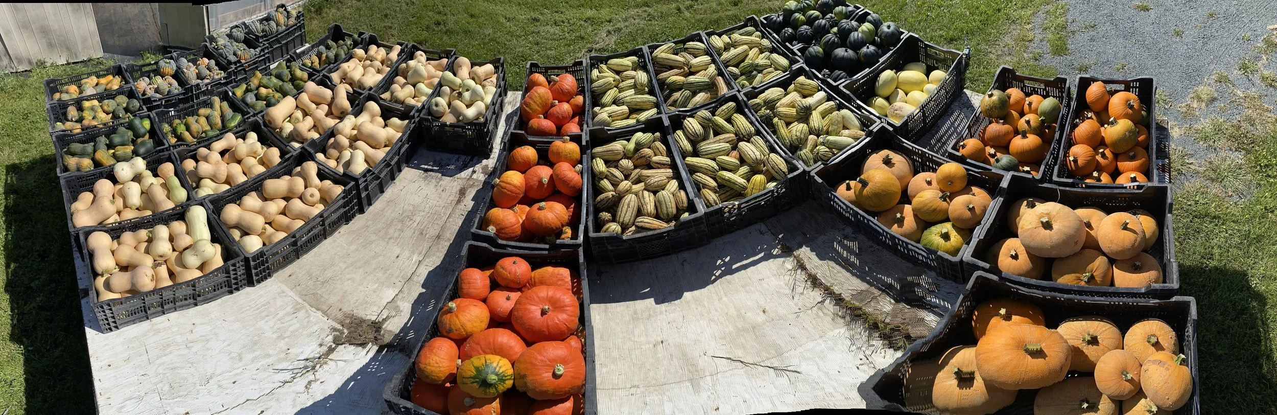From left to right. Black Futsu, Honey Nut, Butternut, Sunshine Kabocha, Delicata/Honeyboat, Acorn, Spaghetti, two kinds of pie pumpkins.