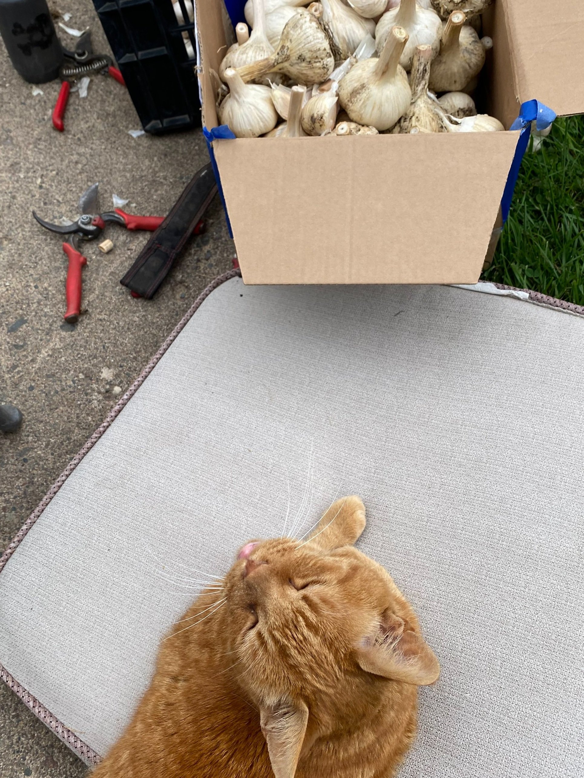 Milton inspects our garlic cleaning operation on the comfort of a patio chair pillow.